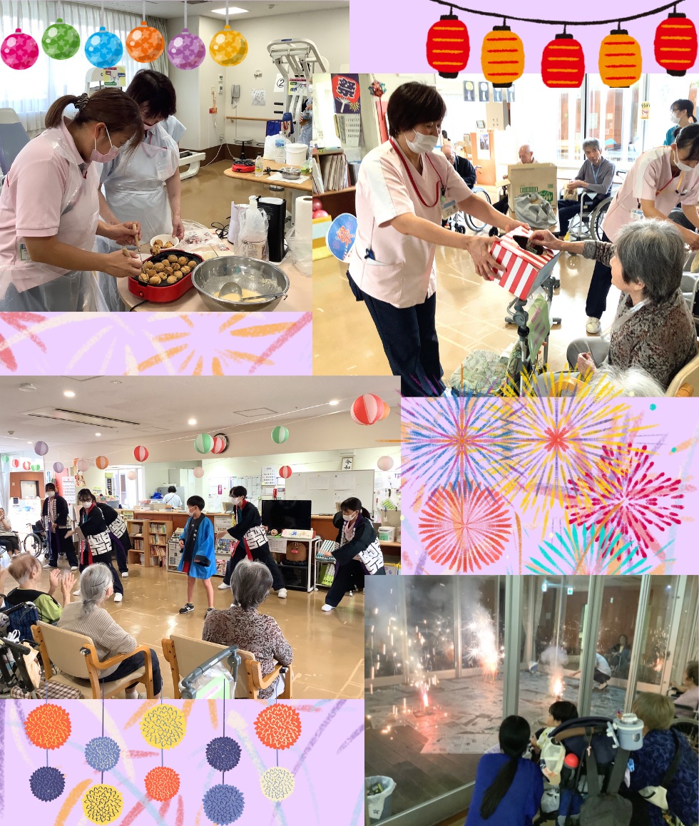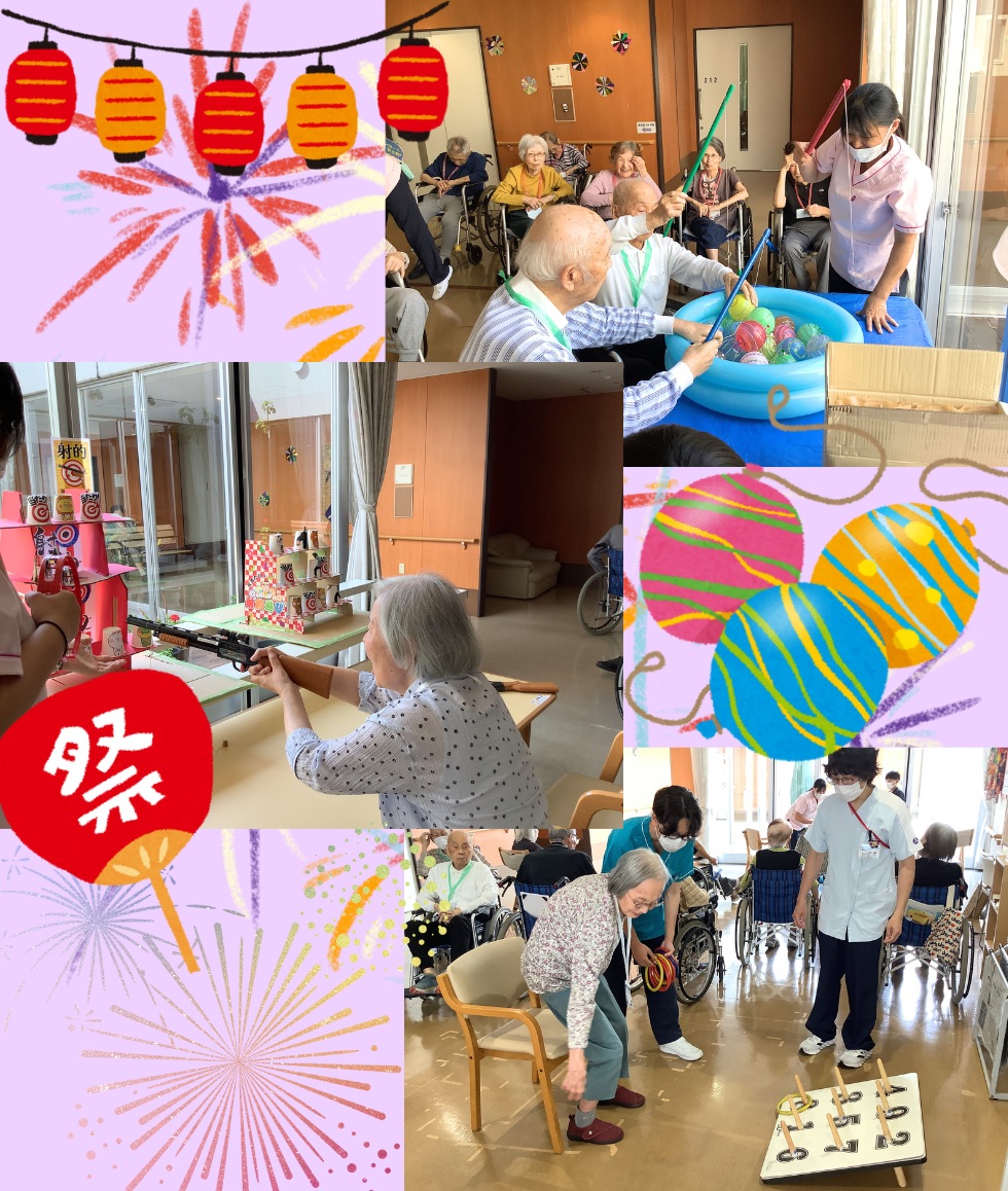 8/24入所では入所では「納涼祭」を開催しました。昼の部は射的や輪投げなどのゲーム、学生ボランティアさんのソーラン節、抽選会などを行い、おやつにはたこ焼き・綿あめ・かき氷を食べました。夜の部は職員によるシャボン玉披露と花火を鑑賞しました(*^▽^*)